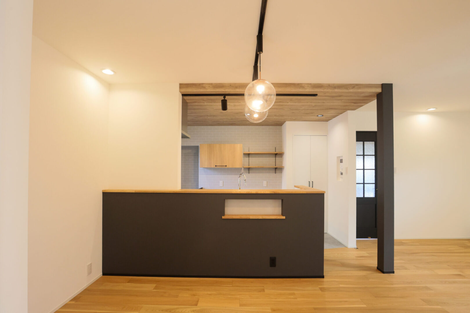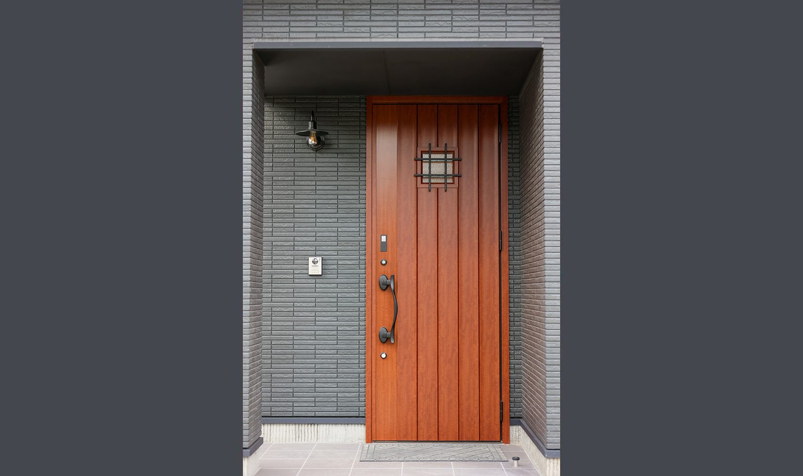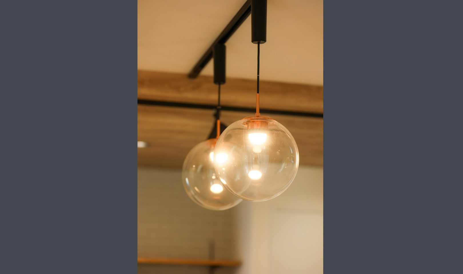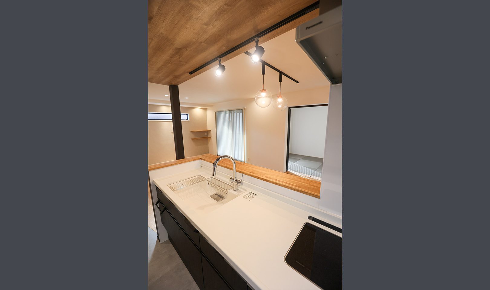 外観はガンメタル色のガルバリウム合板で強さを強調。内装はニュアンスカラーのクロスや、ペンダントで施主様らしい優しさを出しました。