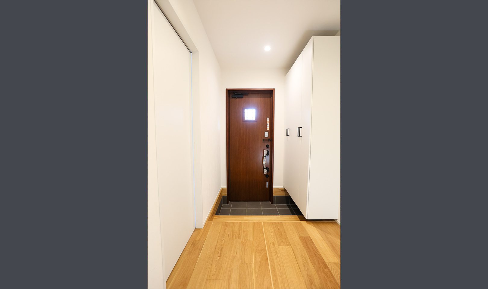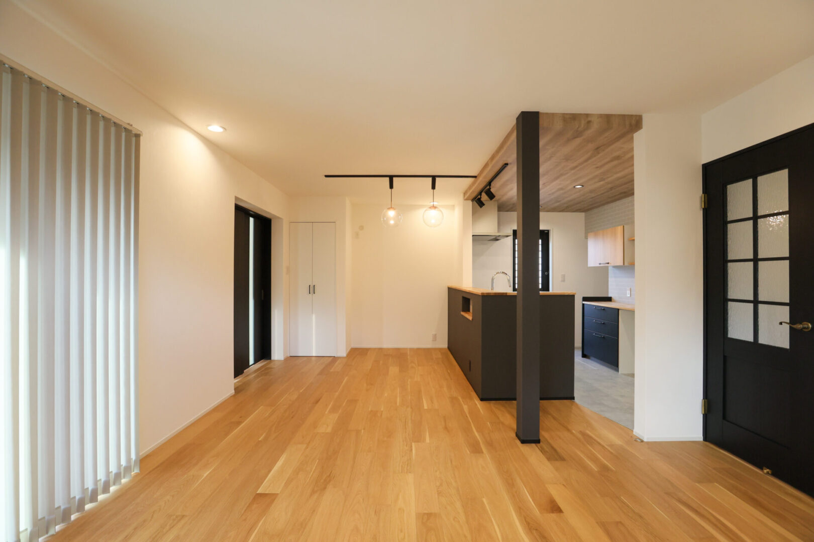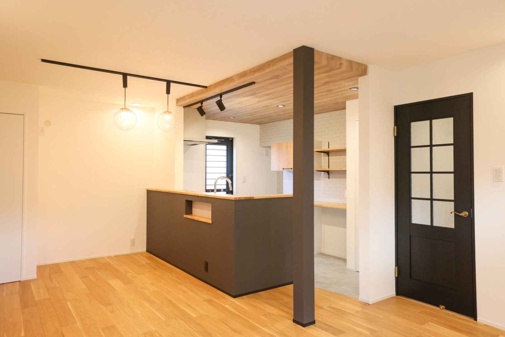 外観はガンメタル色のガルバリウム合板で強さを強調。内装はニュアンスカラーのクロスや、ペンダントで施主様らしい優しさを出しました。