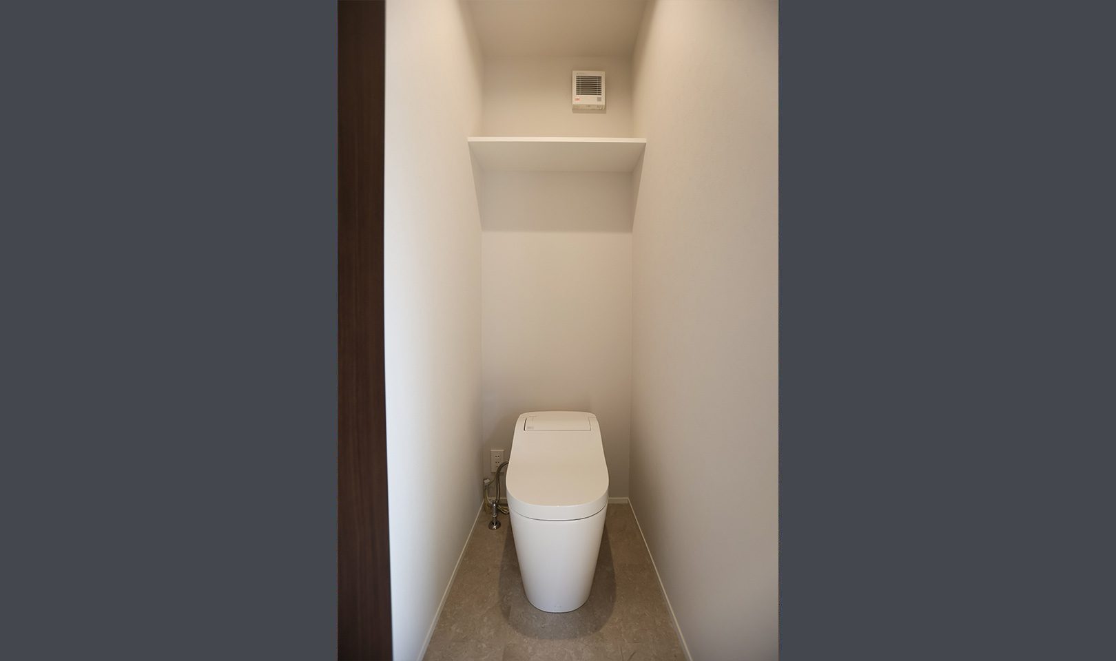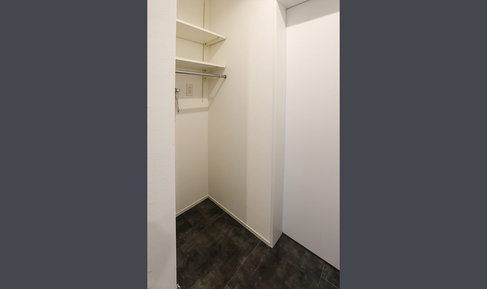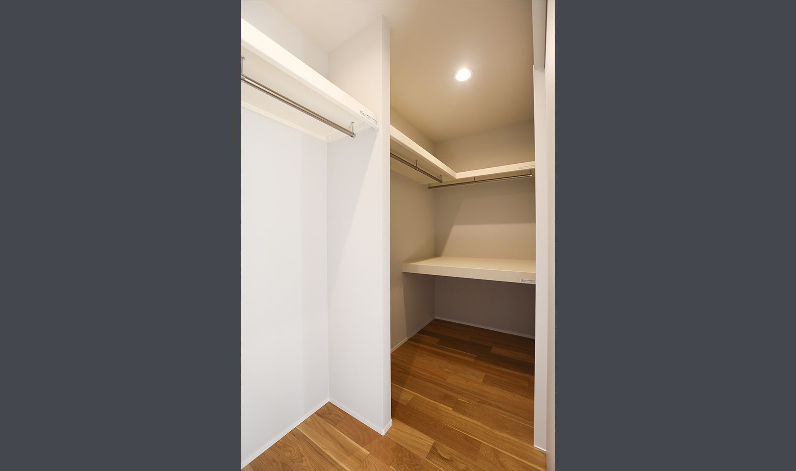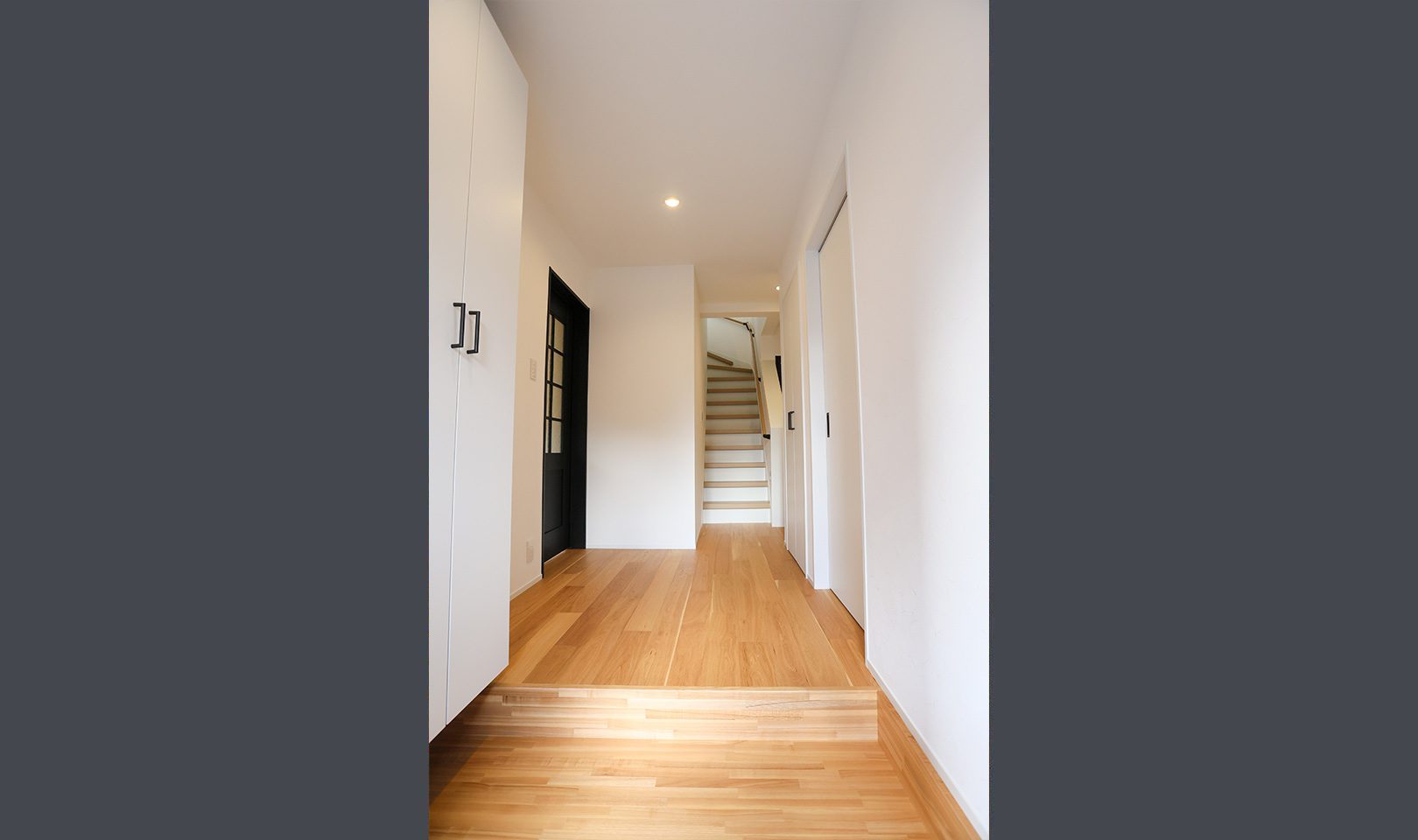 外観はガンメタル色のガルバリウム合板で強さを強調。内装はニュアンスカラーのクロスや、ペンダントで施主様らしい優しさを出しました。