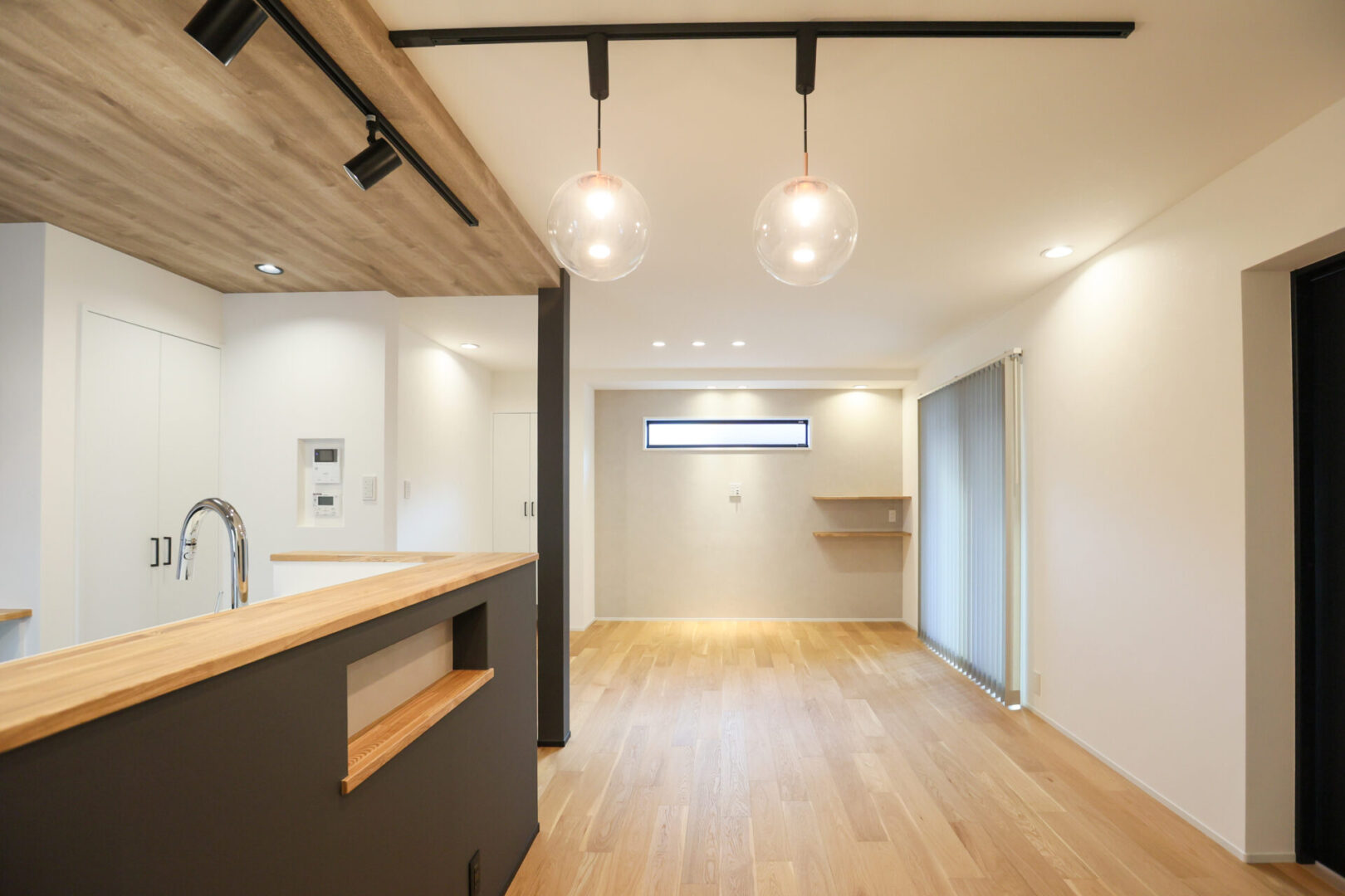 上質な木目の床材が落ち着いた空間にさせてくれるほぼ平屋のお家です。