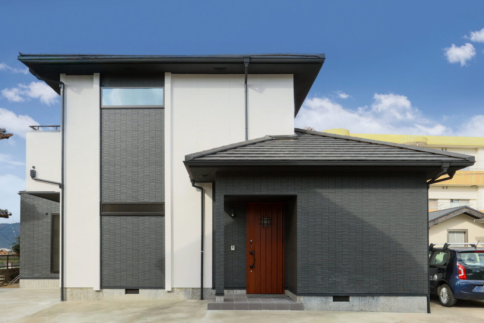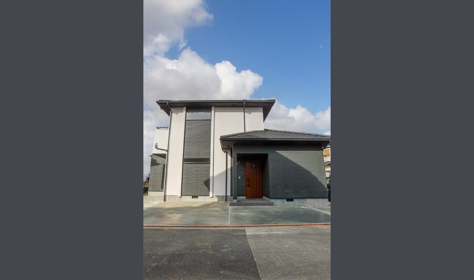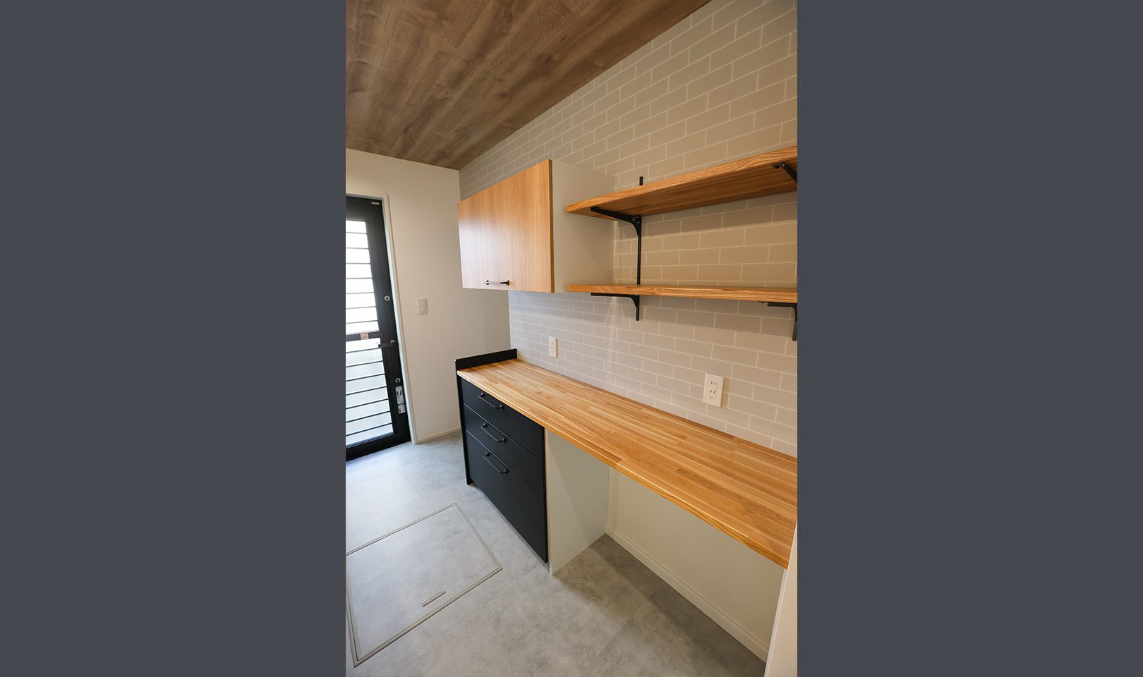 外観はおしゃれなカフェ風で中に入るとグレーと木目のインテリアがかわいい平屋のお家です♪